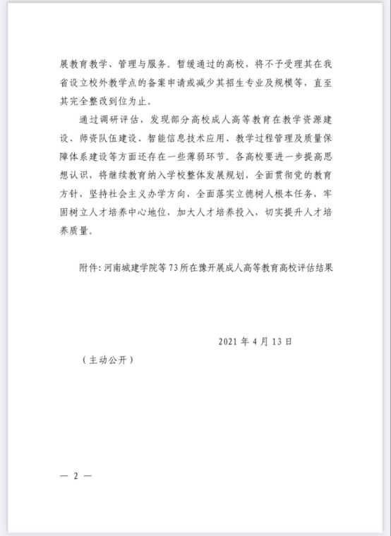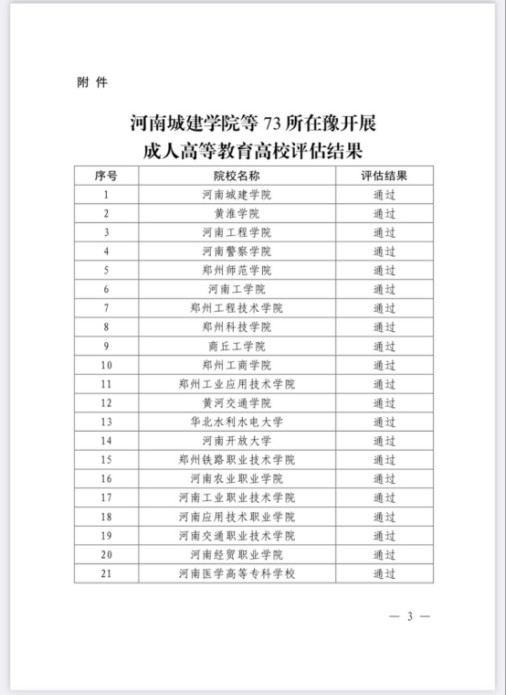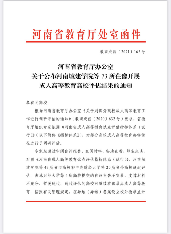 近日,河南省教育厅办公室下发了《关于公布河南城建学院等73所在豫开展成人高等教育高校评估结果的通知》,公司成人高等教育顺利通过专家评估,评估结果为“合格”。