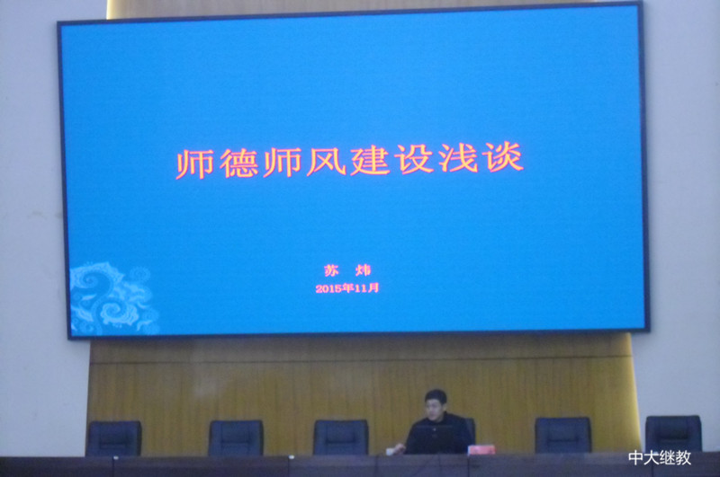 在学术报告厅,由苏炜书记讲授《师德师风建设浅谈》,重申在当今社会师德师风建设的重要意义。教师,是一个神圣的称呼;师德,不是简单的说教,而是一种精神体现,是一种深厚的知识内涵和文化品位的体现;师德,需要培养,需要教育,更需要的是——每位教师的自我修养!